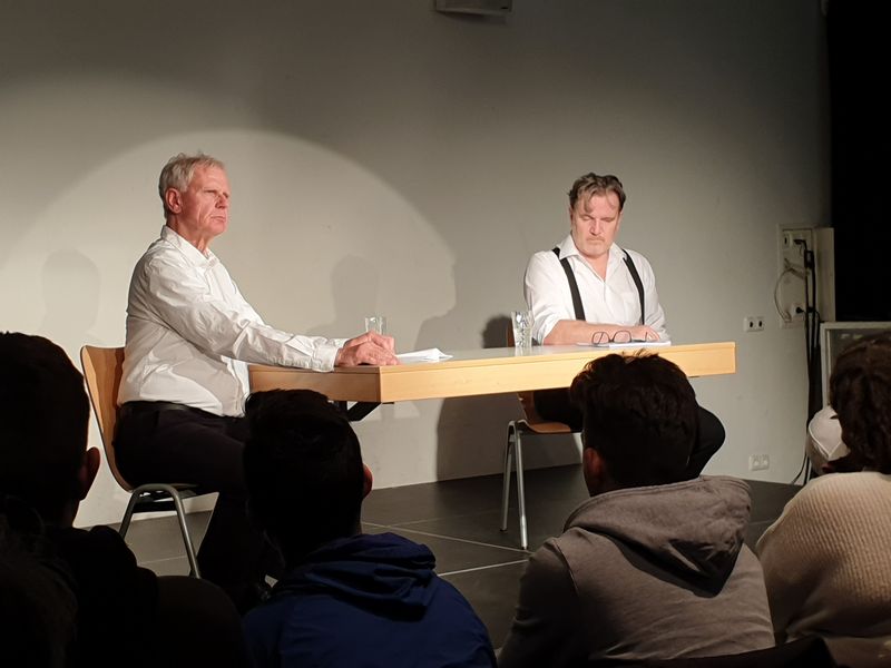 Eindrucksvoll gespielt und abgelesen, um den Dokumentarcharakter eingängig zu machen, entsprechen die von Surhold gesprochenen Worte dem Wortlaut Eichmanns: „Ich habe nie wirklich etwas damit zu tun gehabt, ich habe lediglich die Befehle und Anweisungen von oben befolgt“. Unfassbar und erschreckend ist das Bild, das sie von Eichmann, dem Inbegriff eines Schreibtischtäters, zeichnen. Ein Mann, der nicht hätte Arzt werden können, weil er kein Blut sehen kann, ließ von 1941 bis 1945 als Leiter des „Judenreferats IV B 4“ im „Reichssicherheitshauptamt“ Millionen Juden in Konzentrations- und Vernichtungslager deportieren. Trotz der Kenntnis über die Vernichtungslager ­­— nach eigener Besichtigung ­­— trieb er die Zahl der deportierten Juden durch eine perfektionierte, bis ins Kleinste ausgeklügelte Organisation der Verkehrsplanung  in die Höhe. Seine Sorge galt den armen Schützen, die die Mütter und Kinder erschießen mussten. Seine Rechtfertigungen sind eine Verhöhnung der Opfer. Unverständlich sind sie auch den Schülerinnen und Schülern, die nach der 50 minütigen Lesung zu Wort kamen. Sie hatten nun die Gelegenheit mit den Schauspielern in den Dialog zu treten und nutzen diese auch. Ihre Fragen rund um den Prozess und die Persönlichkeit Eichmanns spiegeln ihr Entsetzen wider. Sie beriefen sich auch auf ihr eindrucksvolles Vorwissen, setzten es in Beziehung zu dem eben Gesehenen, zu den Worten Eichmanns und erkannten die Unbegreiflichkeit.