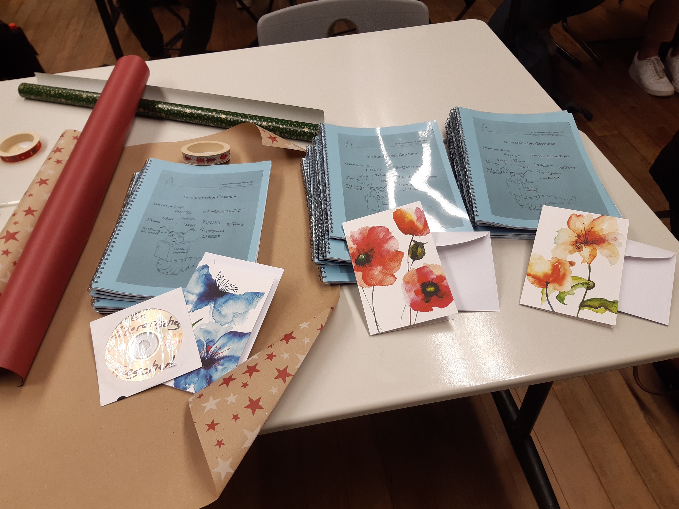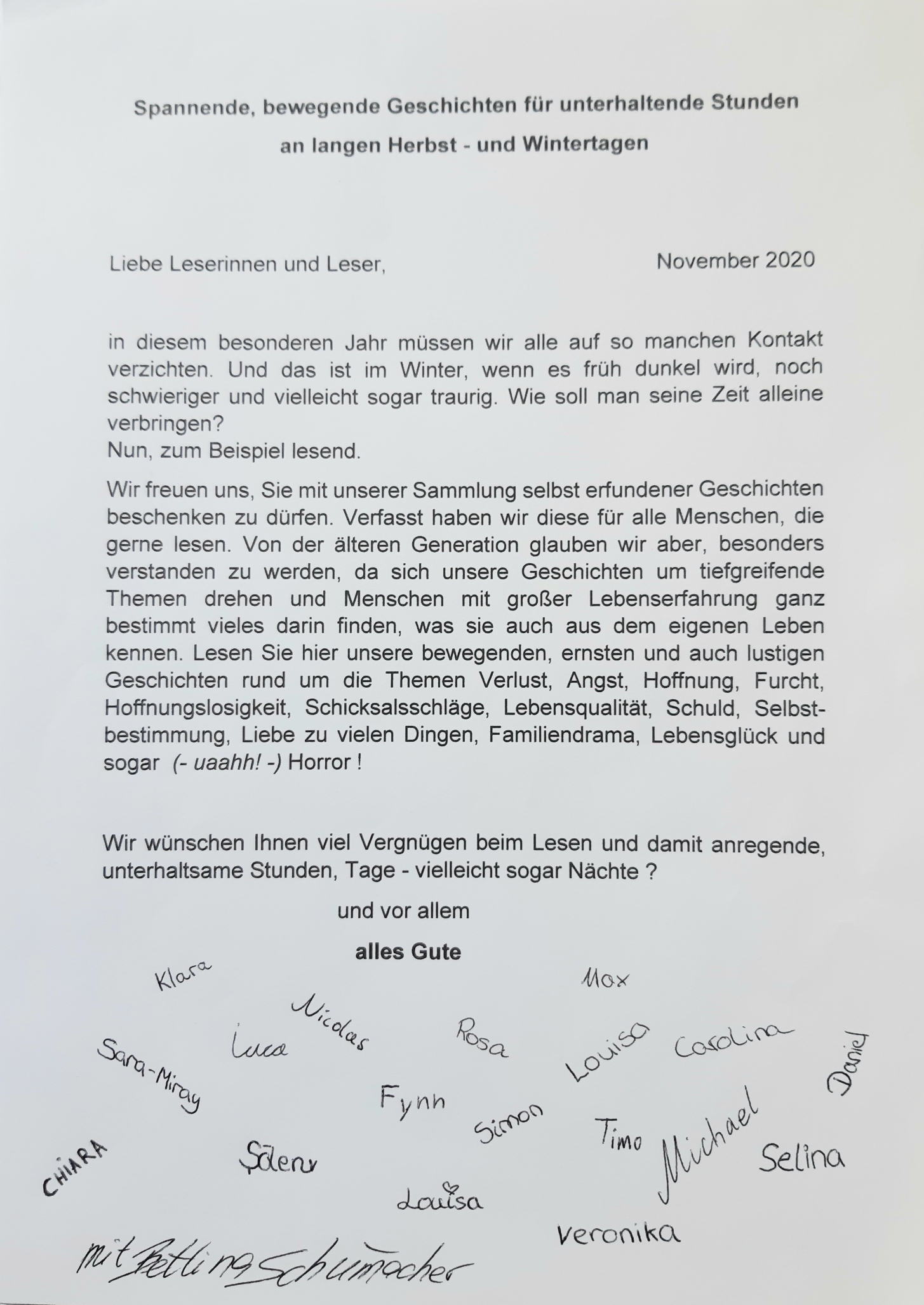Dafür hat jeder von uns eine Geschichte geschrieben, die wir gesammelt als ein Werk an drei Seniorenheime aus der Umgebung spenden. Die Bewohnerinnen und Bewohner des Caritas Zentrums St. Bardo in Friedberg, des Cura Sana Pflegeheims in Wöllstadt und der Seniorenresidenz „Elisabeth Selbert“ in Altenstadt hoffen wir damit zu erfreuen. Unser Werk umfasst gut 30 Seiten und wird vervielfältigt, damit jedes Haus mehrere Exemplare erhält.