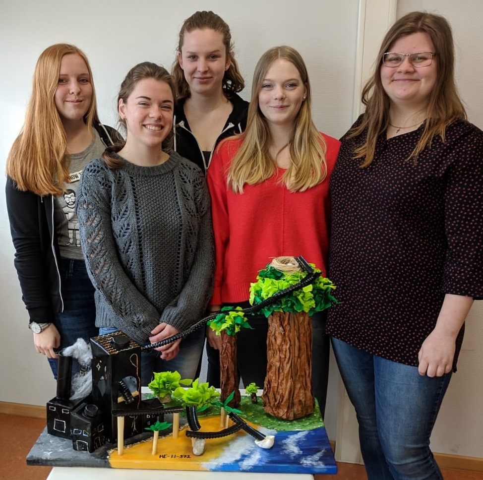 Marie Dousa, Avija Morell, Liv Nitsche, Lisa Wicke und Katharina Zadneprovskiy aus den Q2-Physikkursen von Herrn Dr. Zscherp und Herrn Peter schafften es, nach vielen Stunden Planungs- und Bauzeit ein beeindruckendes Modell termingerecht anzufertigen, das im Sinne eines „Upcycling“ auch verschiedene Wertstoffe einer neuen Verwendung zuführte. Dabei offenbarte sich ein hohes Maß an Kreativität und handwerklichem Geschick (siehe Bild). Nach der Fertigstellung musste die Achterbahn noch nach Wiesbaden gebracht werden, um bei der Ingenieurkammer Hessen von einer hochrangig besetzten Jury begutachtet zu werden. Die Konstrukteurinnen wurden gemeinsam mit dem betreuenden Lehrer, Herrn Peter, am 30.04.2019 zur Siegerehrung des landesweit ausgeschriebenen Wettbewerbs nach Gießen eingeladen, wo ihr Engagement mit einer Urkunde belohnt wurde.